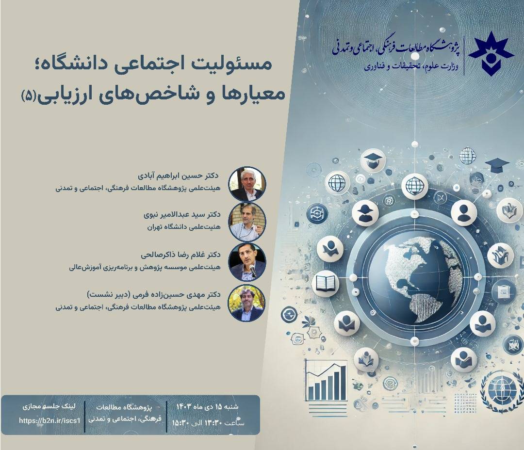 پنجمین نشست از این سلسله نشستها با عنوان « مسئولیت اجتماعی دانشگاه؛ معیارها و شاخصهای ارزیابی » روز شنبه ۱۵ دی ماه ۱۴۰۳ از ساعت ۱۳:۳۰ تا ۱۵:۳۰ با حضور حسین ابراهیم آبادی؛ عضو هیئت علمی پژوهشگاه مطالعات فرهنگی، اجتماعی و تمدنی، سید عبدالامیر نبوی؛ عضو هیئت علمی دانشگاه تهران، غلامرضا ذاکر صالحی؛ عضو هیئت علمی مؤسسه پژوهش و برنامهریزی آموزش عالی برگزار خواهد شد. دبیر علمی نشست مهدی حسینزاده فرمی؛ عضو هیئت علمی پژوهشگاه مطالعات فرهنگی، اجتماعی و تمدنی است.